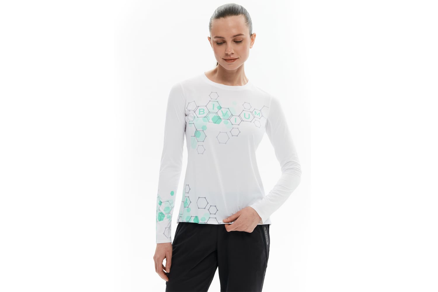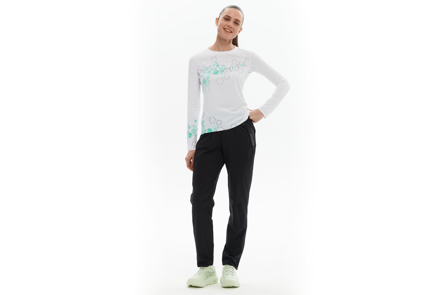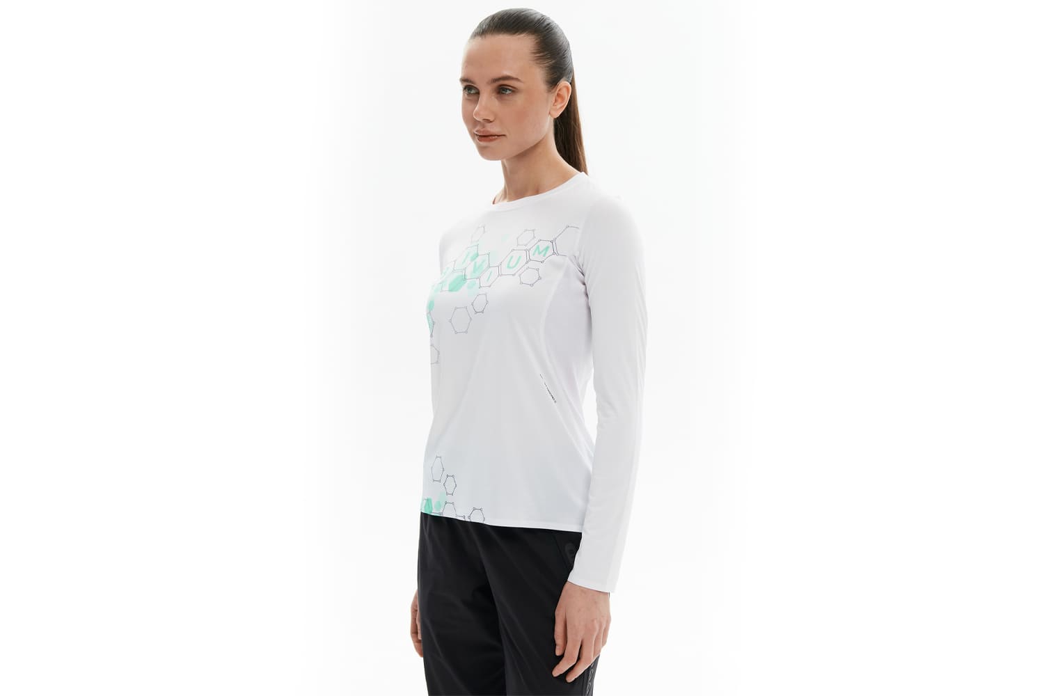 Принт с молекулами спереди отсылает к идее коллекции — поиску собственной формулы движения, а мотивирующая надпись сбоку даст скрытый импульс продолжать движение
