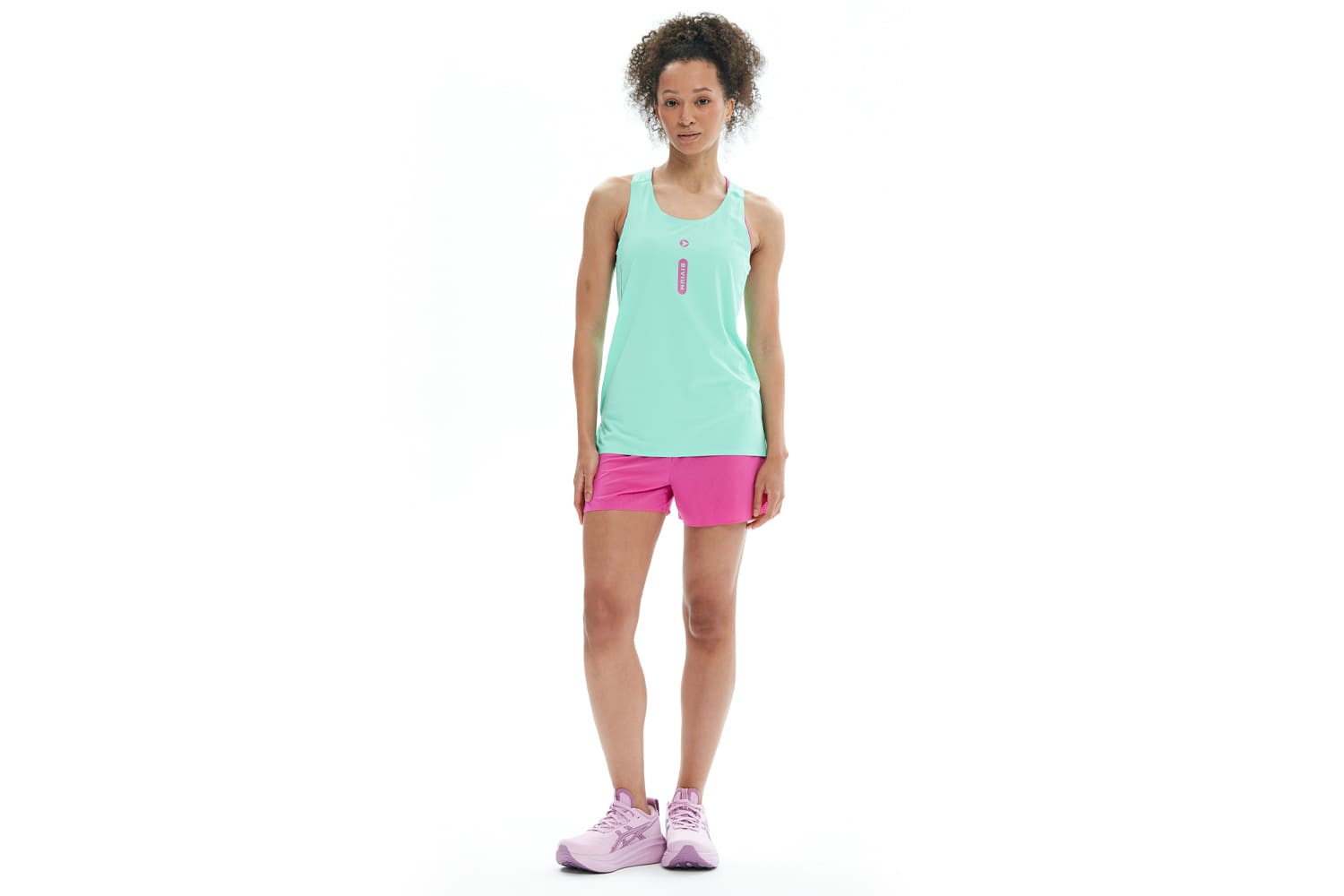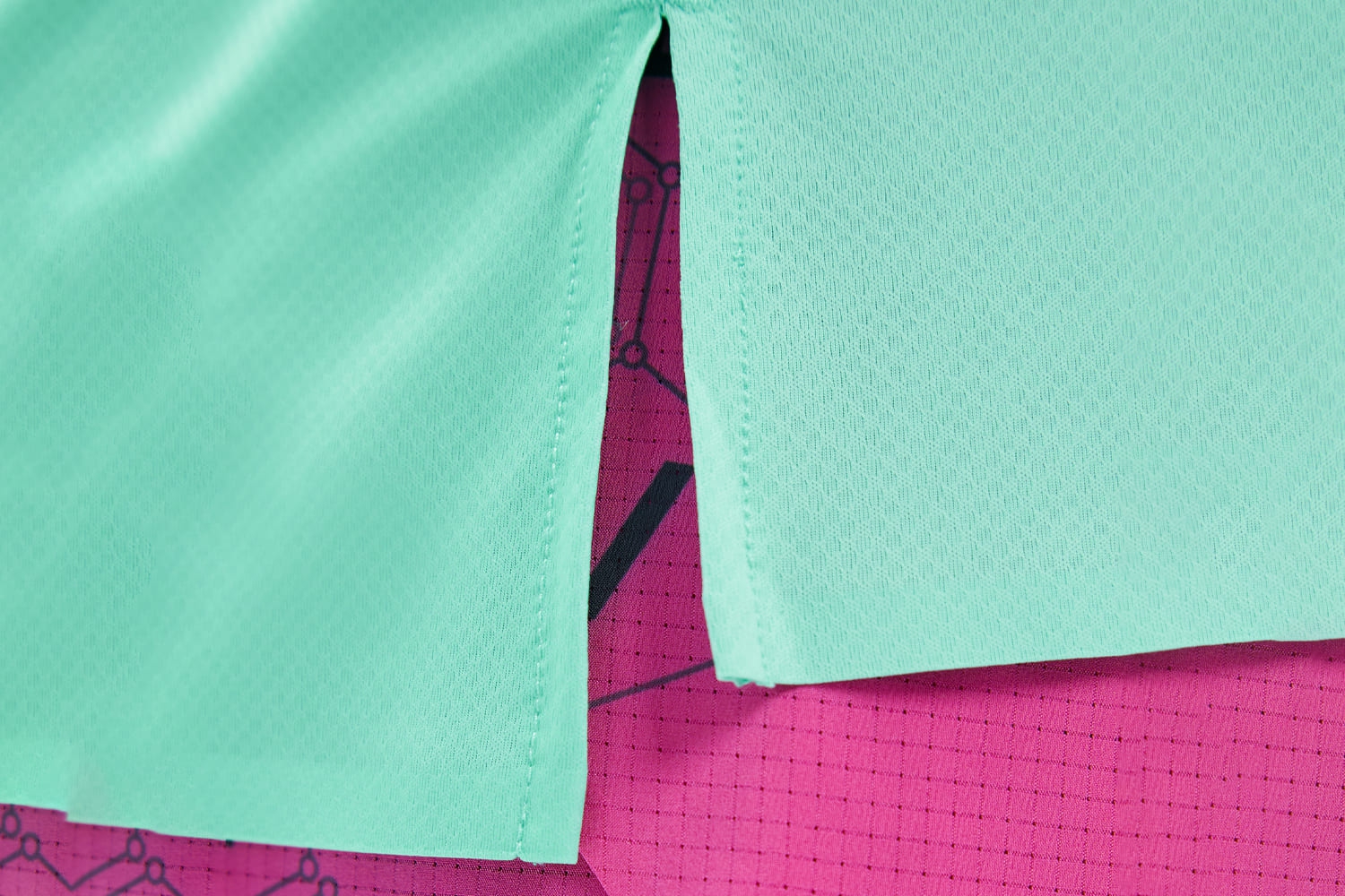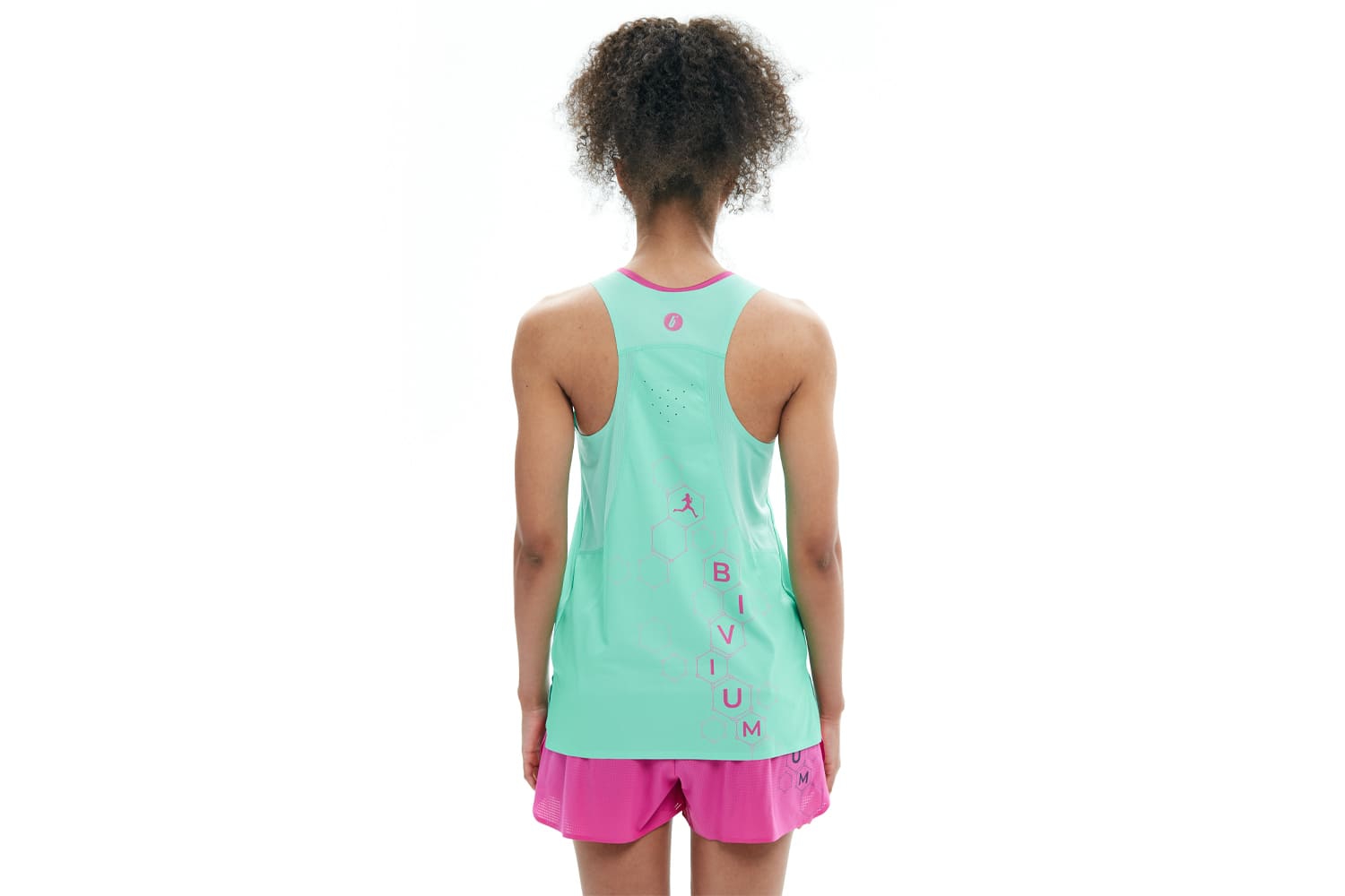 Светоотражающие элементы для безопасности тренировок в темноте. Принт с молекулами на груди отсылает к идее коллекции — поиску собственной формулы движения. Принт нанесён методом сублимации и сохраняет яркость со временем.
