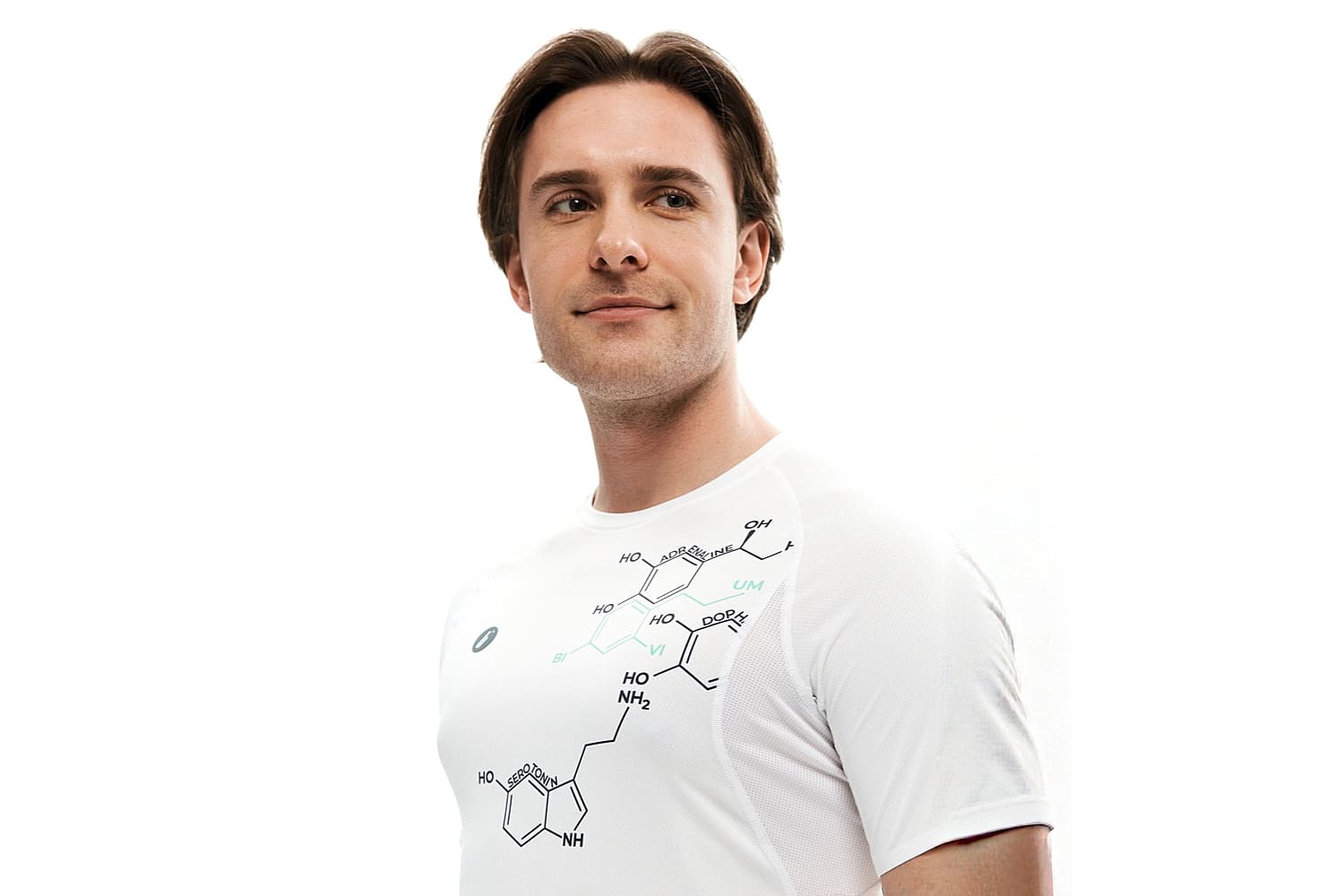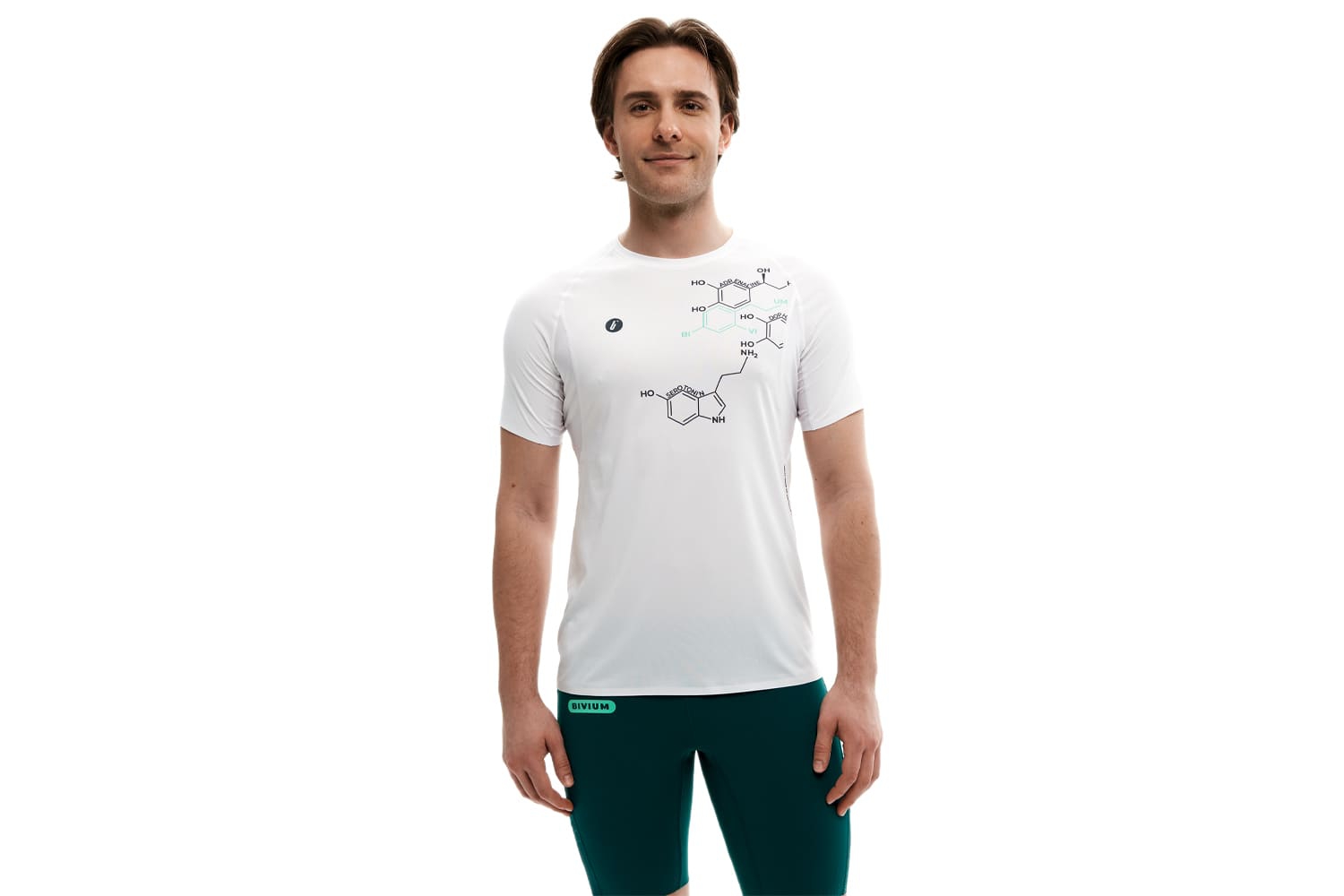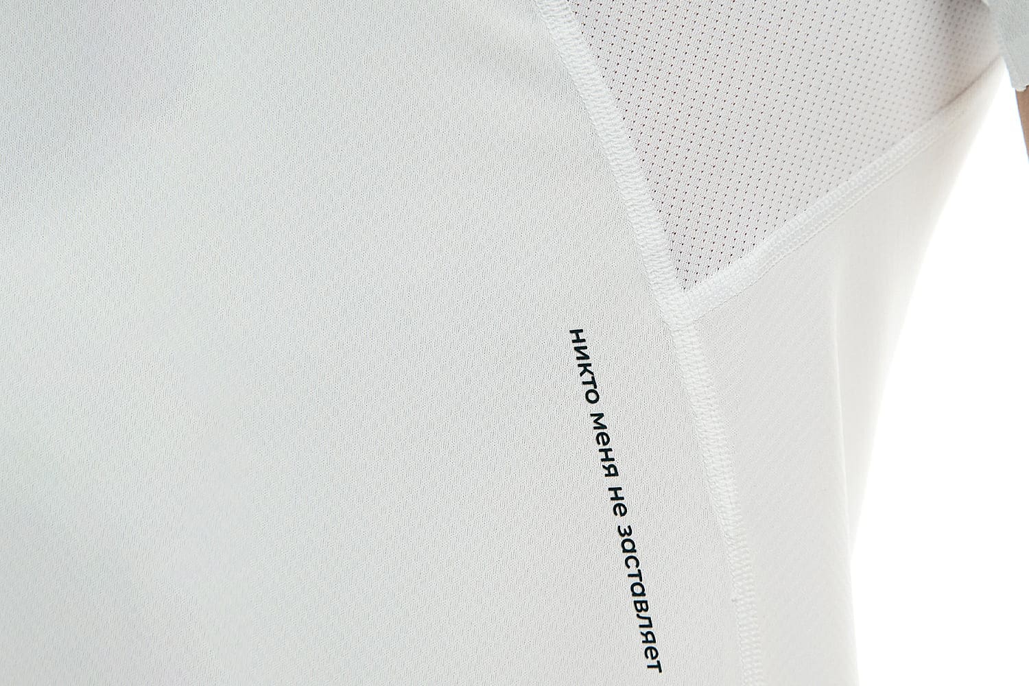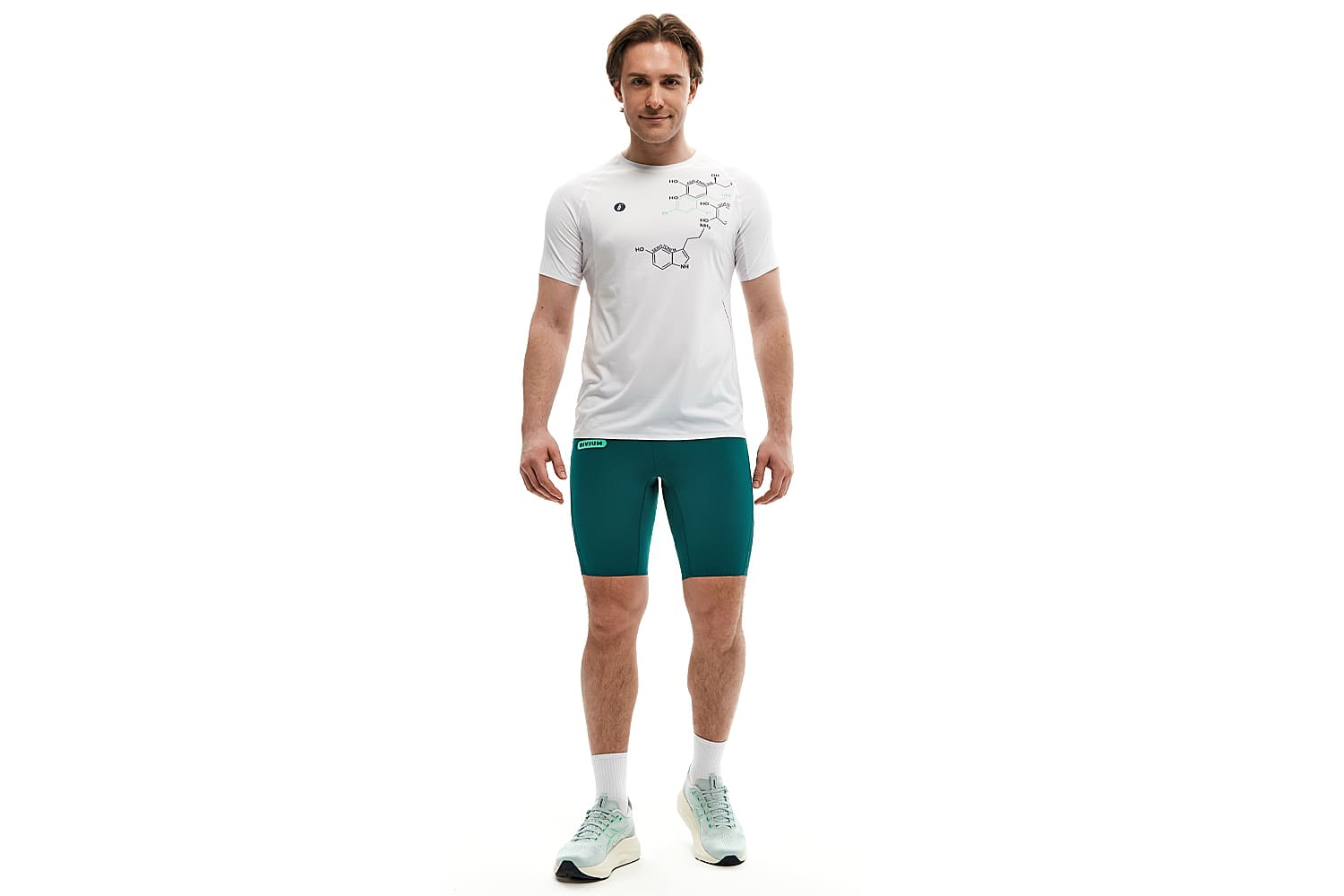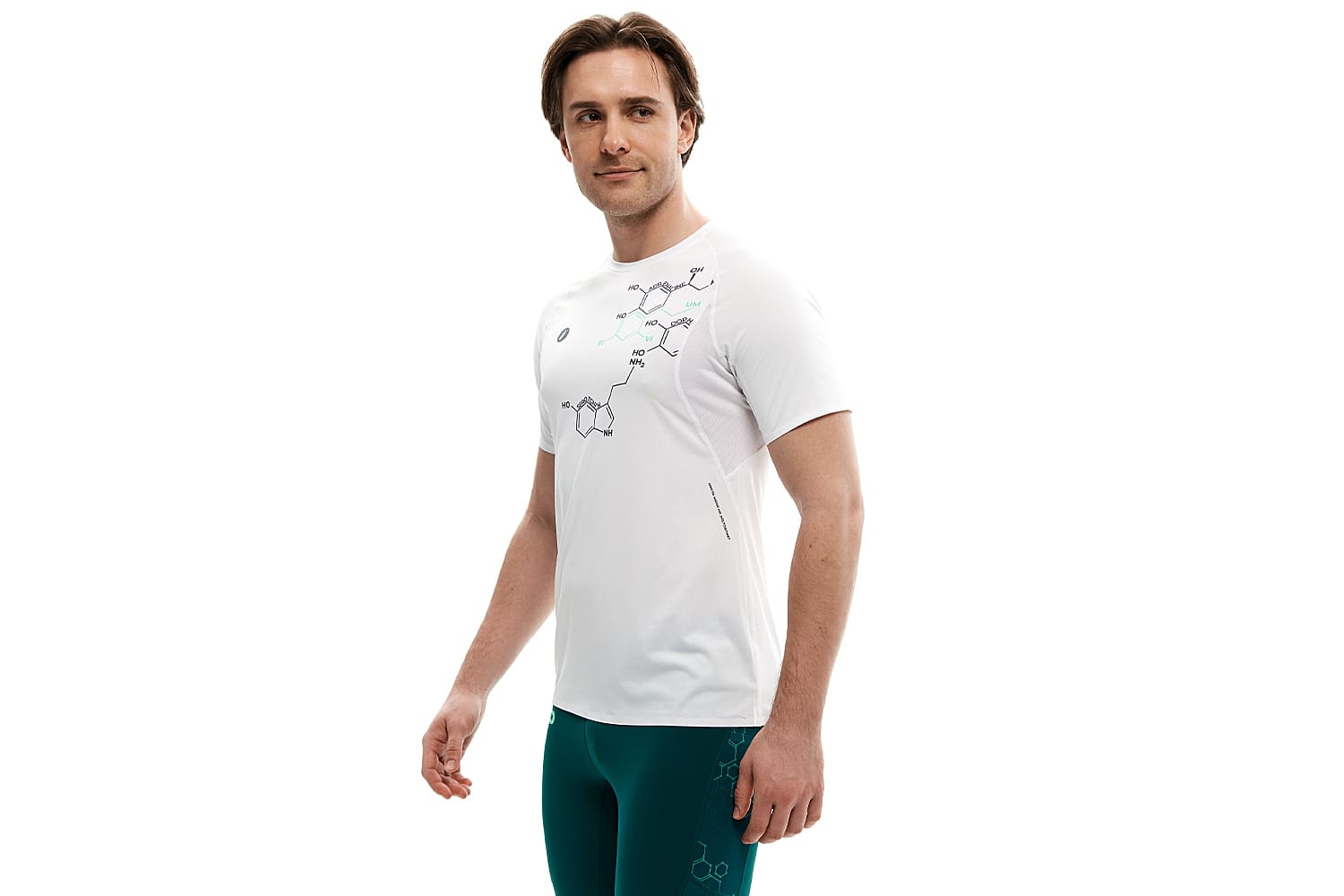Принт с молекулами на груди и мотивирующая надпись сбоку отсылают к идее коллекции — поиску собственной формулы активности.