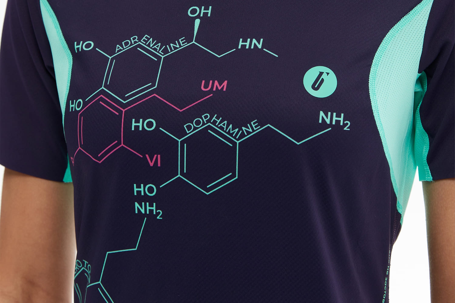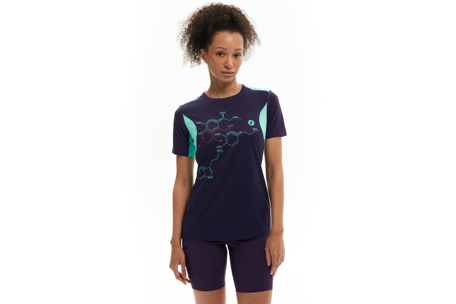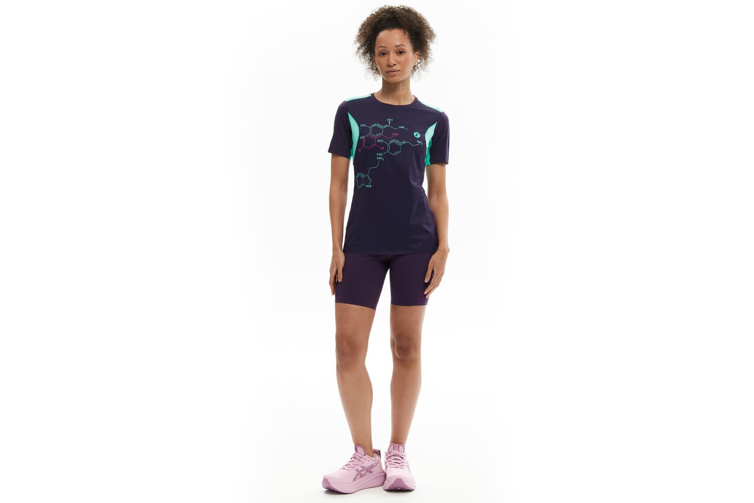 Принт с молекулами на груди и мотивирующая надпись сбоку отсылают к идее коллекции — поиску собственной формулы активности.