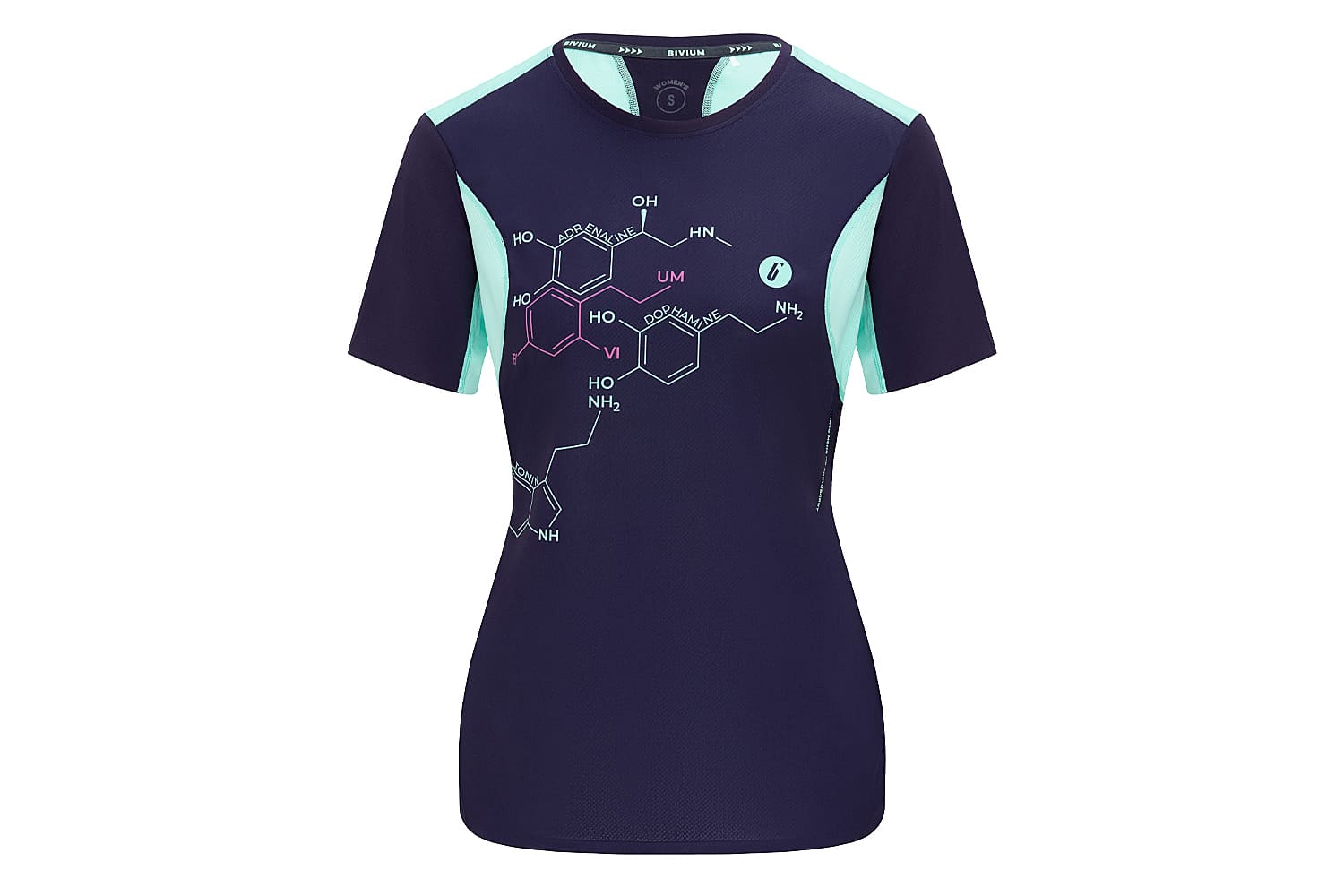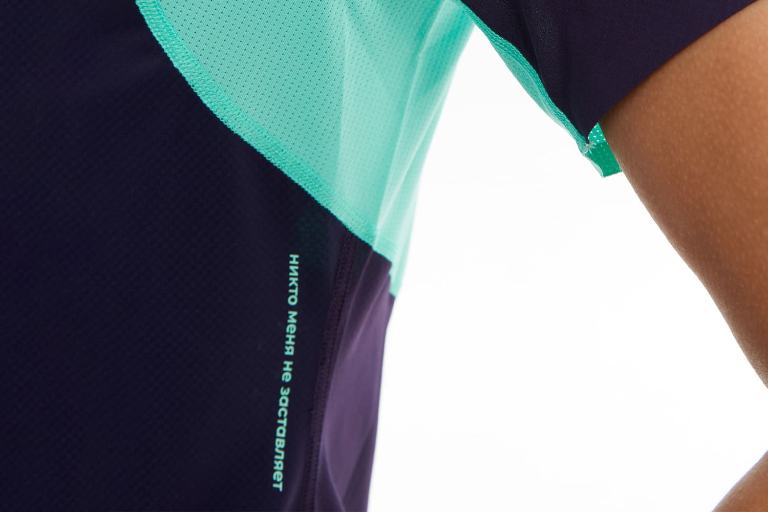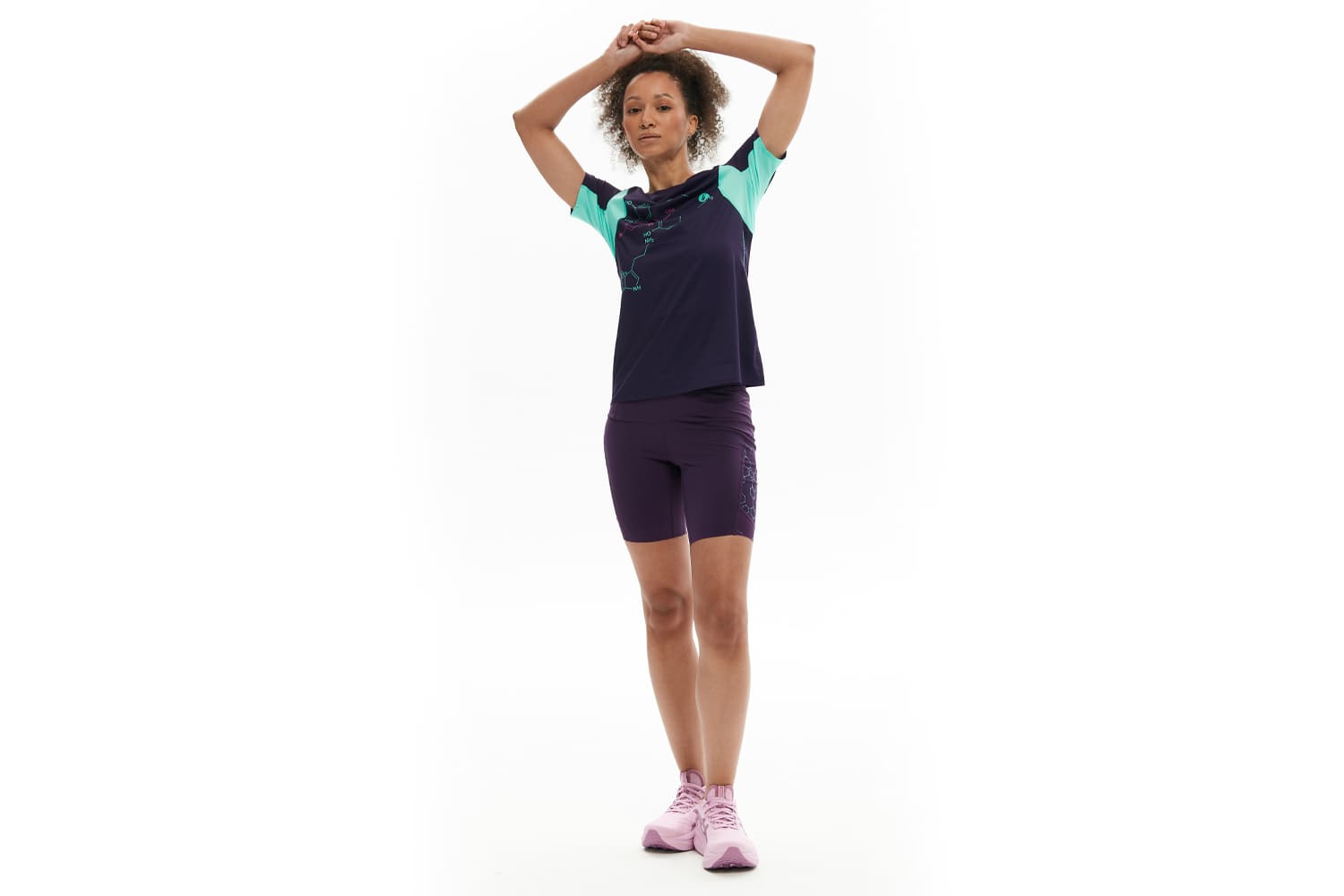 Принт с молекулами на груди и мотивирующая надпись сбоку отсылают к идее коллекции — поиску собственной формулы активности.